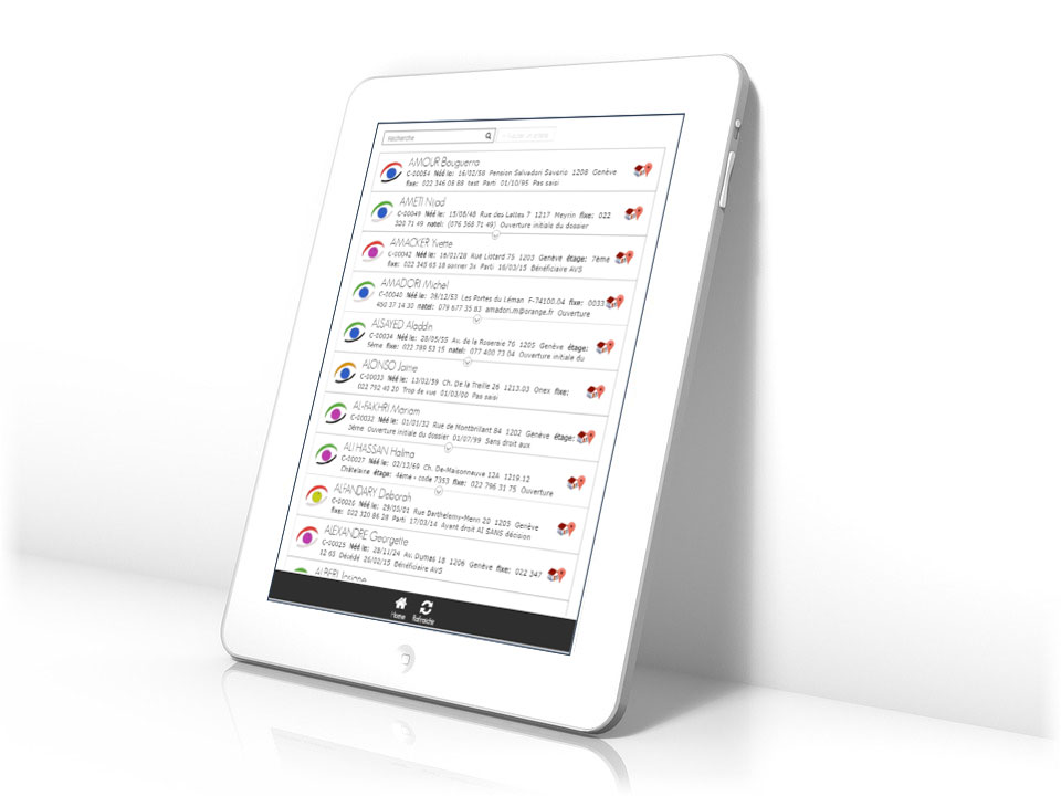 La gestion des dossiers sociaux, des temps et du journal des interventions est utilisée sur le terrain, en mobilité. Les assistants/es sociales/aux et les ergothérapeutes se déplacement avec leur tablette ou leurs pcs, et voient leur carnet de rendez-vous, la localisation du client et les derniers nouvelles à connaitre le concernant. Il s’agit de voir rapidement les priorités et les choses essentielles.